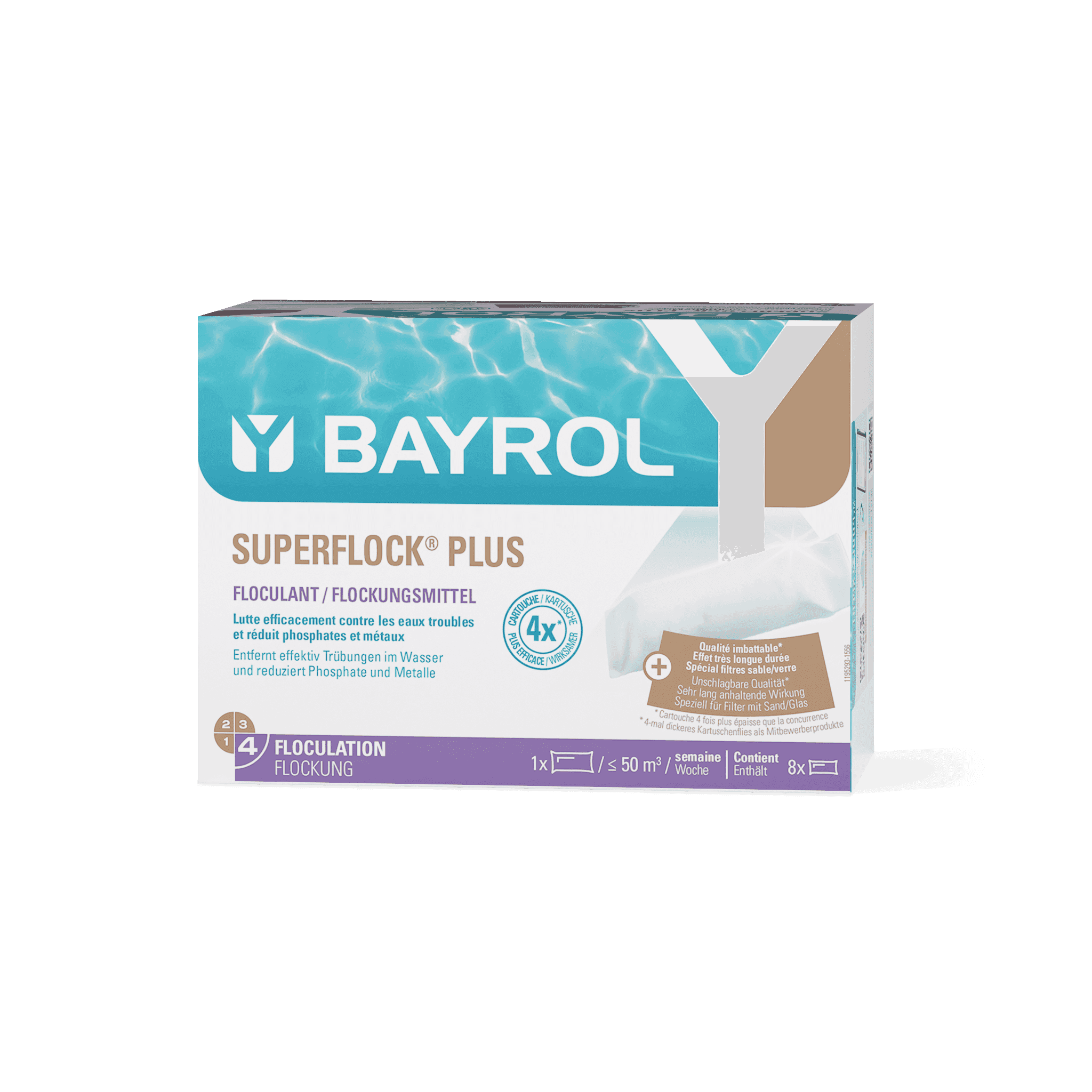 Mit Superflock Plus wird das Poolwasser schnell wieder klar. Die spezielle Formel und das im Superflock Plus enthaltene Lanthan entfernen zuverlässig Metall-Ionen (eisenhaltiges Brunnenwasser) und Phosphate (Algennahrung), die für die Vermehrung von Algen verantwortlich sind.